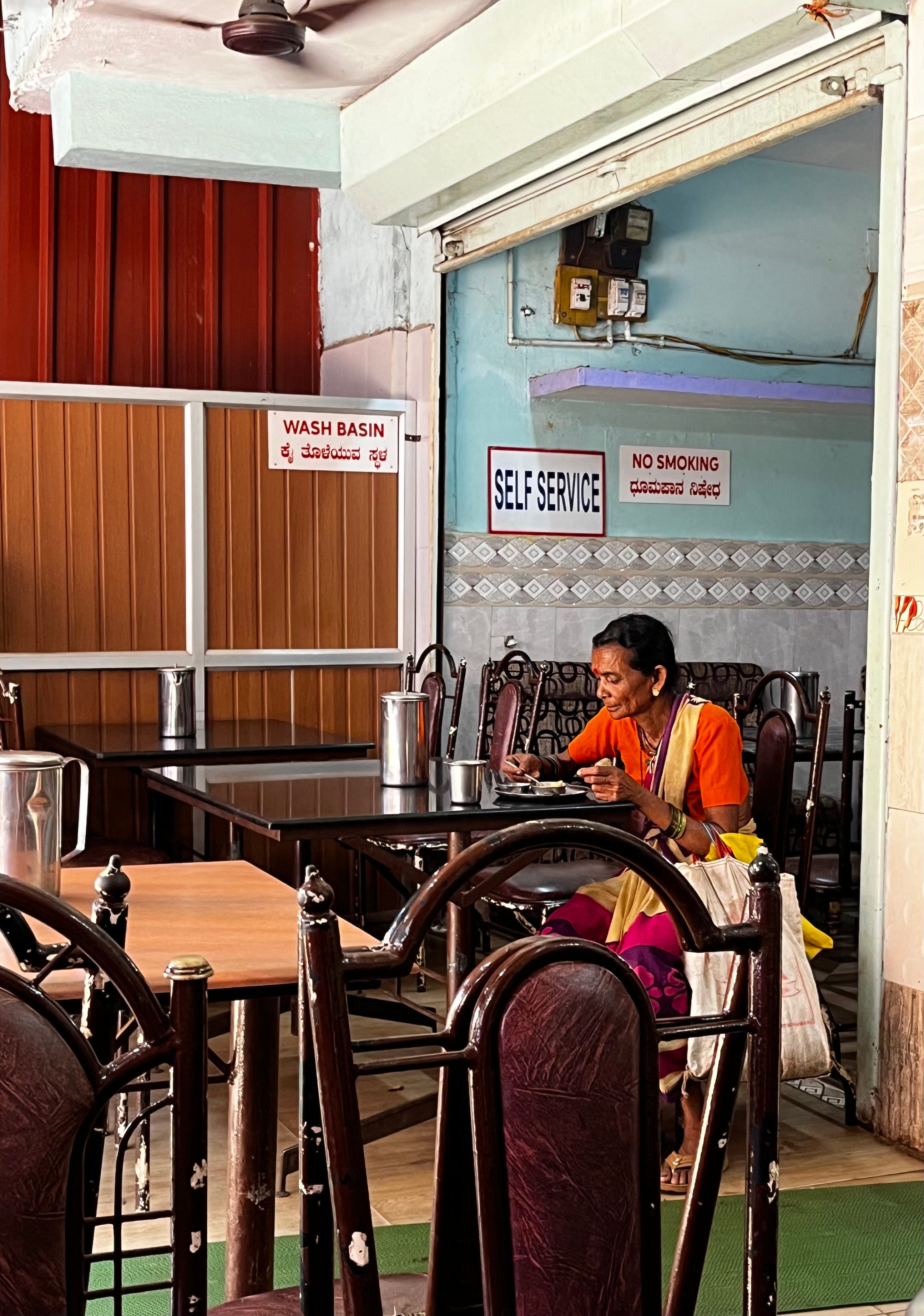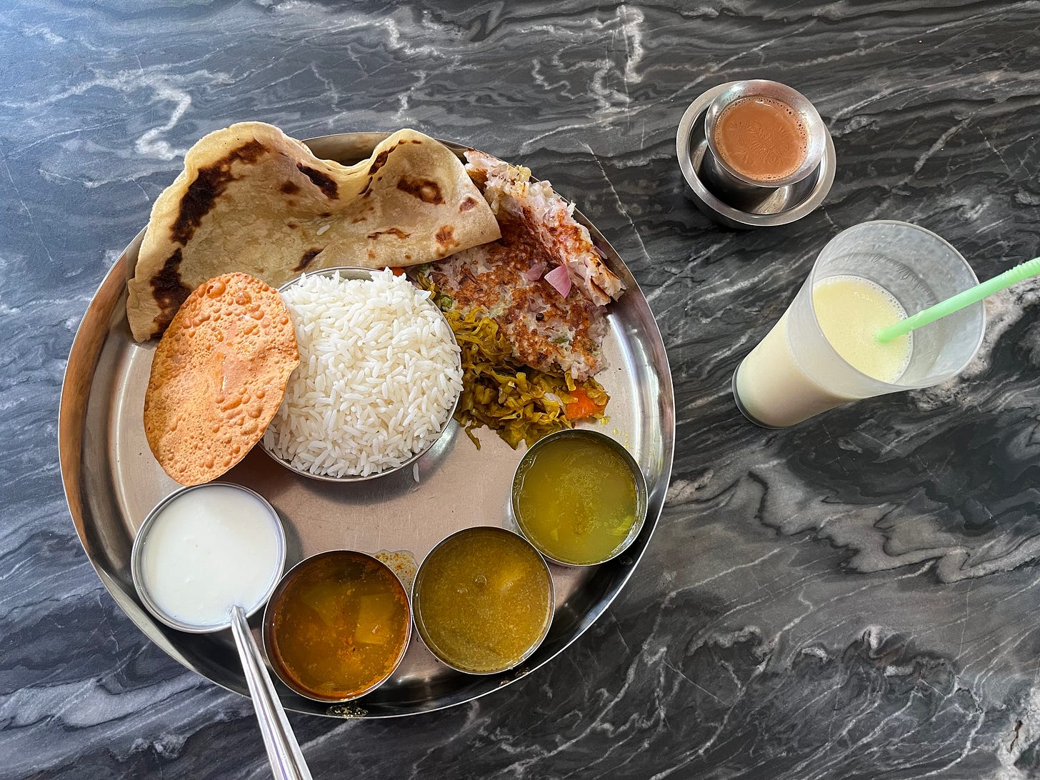 First I wandered around the village to find the most looking non-touristy restaurant I could find and parked myself there for an hour to try as much new food as I could fit in my belly! Most people come and go as quickly as possible - a perfect place to sit people watching. I tried an uttapam for the first time, which is like an onion omelette made with rice flour that’s fermented so it ends up a bit 'bready’ and it’s served with spicy green peas. Delicious. And then instinctively I get the thali to try a range of the local gravies. And of course, chai and lassi.